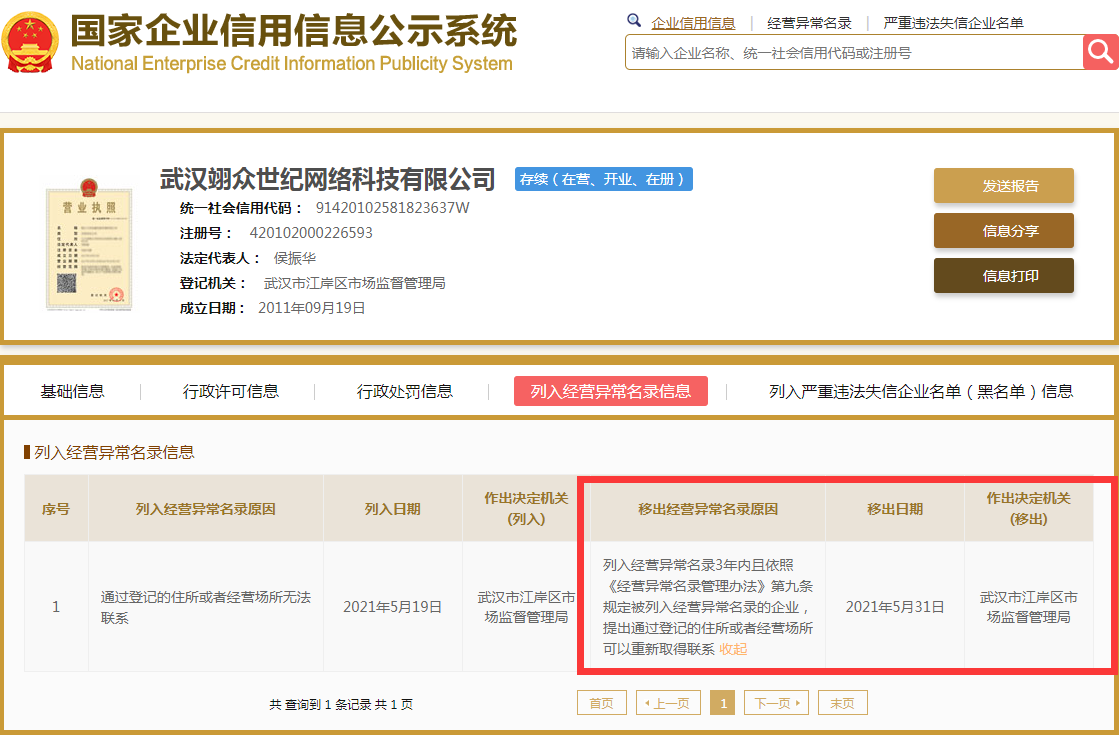 我司于2021年5月19日被錯(cuò)誤操作為”異常經(jīng)營“,原因?yàn)椤辈闊o此址“或”無法聯(lián)系“,實(shí)際上我司一直在注冊地正常辦公,我司第一時(shí)間撥打12345投訴,以維護(hù)我司正常權(quán)益,相關(guān)單位第二天來我司核實(shí),核實(shí)無誤后已提交資料,5月31日移除”異常經(jīng)營“,現(xiàn)已恢復(fù)正常。