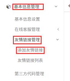 1.進(jìn)入后臺,點擊左側(cè)菜單欄中的【基本信息】,找到并點擊【友情鏈接管理】菜單,并點擊下級【添加友情鏈接】