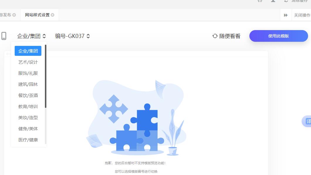 2.在右側(cè)【網(wǎng)站樣式設(shè)置】,在【所屬行業(yè)】中選擇【模板編號(hào)】,最后點(diǎn)擊右側(cè)【使用此模板】