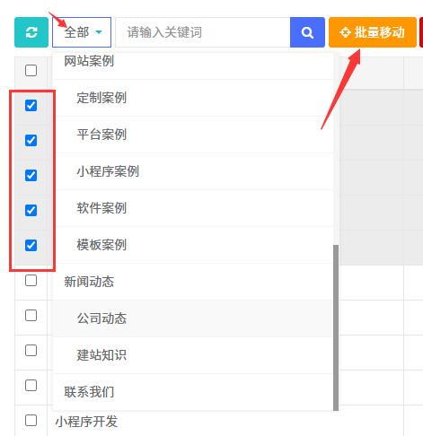 2.在右側(cè)【內(nèi)容管理】選擇需要移動(dòng)的內(nèi)容,點(diǎn)擊【全部】,在下拉框里選擇要轉(zhuǎn)移后欄目的位置,點(diǎn)擊【批量移動(dòng)】