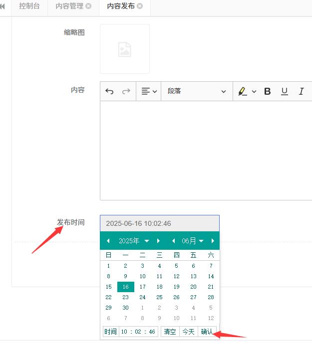 2.選擇年、月、日、時、分、秒,點擊右側(cè)確認(rèn),即【發(fā)布時間】編輯框顯示當(dāng)前時間