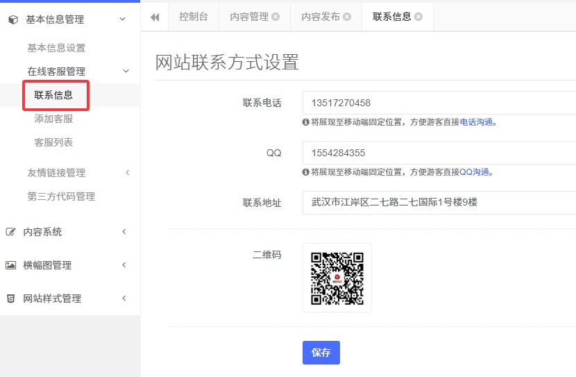2.在右側(cè)【網(wǎng)站聯(lián)系方式設(shè)置】,可填寫聯(lián)系電話,qq,地址,二維碼等
