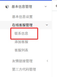 1.進(jìn)入后臺,點(diǎn)擊左側(cè)菜單欄中的【基本信息管理】,在里面找到并點(diǎn)擊【在線客服管理】,點(diǎn)擊下級導(dǎo)航【聯(lián)系信息】
