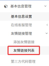 1.進(jìn)入后臺(tái),點(diǎn)擊左側(cè)菜單欄中的【基本信息】,找到并點(diǎn)擊【友情鏈接管理】菜單,并點(diǎn)擊下級(jí)【友情鏈接列表】